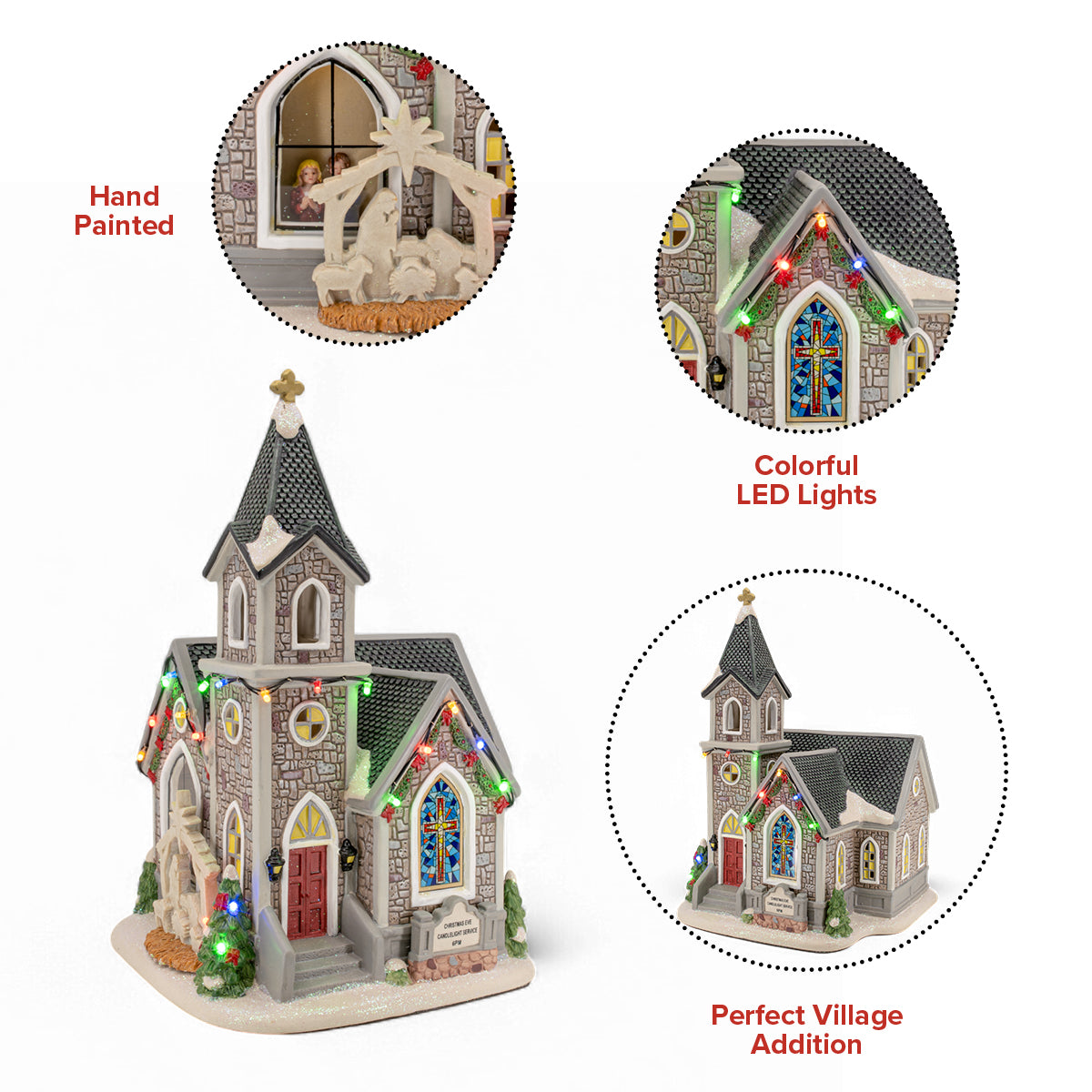 Tall lighted Corner Cathedral Christmas village church with stained‑glass windows, LED lights and detailed porcelain craftsmanship. New 2025 religious centerpiece.